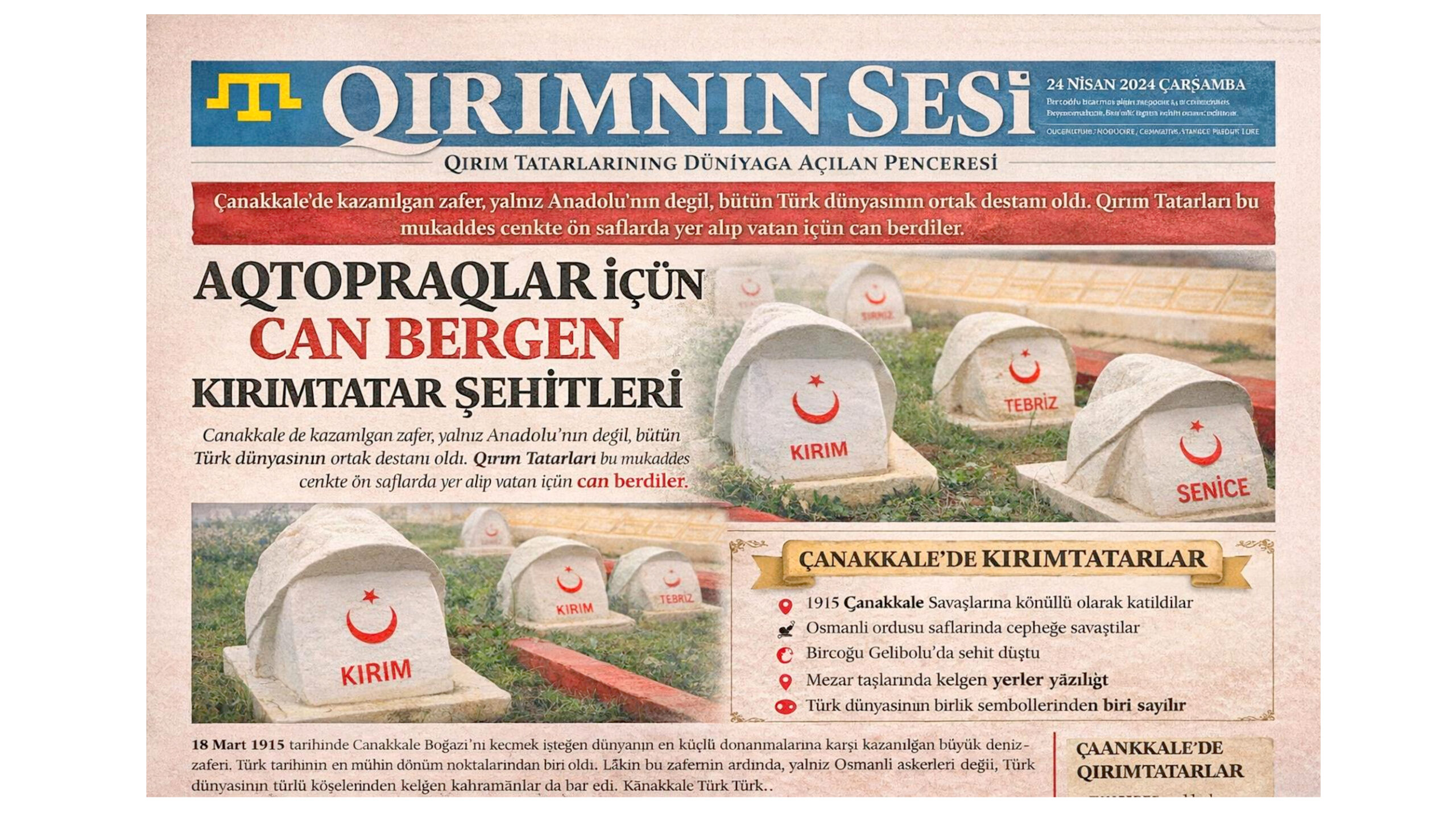Çanakkale’de kazanılan zafer, yalnız Anadolu’nıñ degil, bütün Türk dünyasınıñ ortak destanı oldı. Qırım Tatarları bu mukaddes cenkte ön saflarda yer alıp vatan içün can berdiler.
