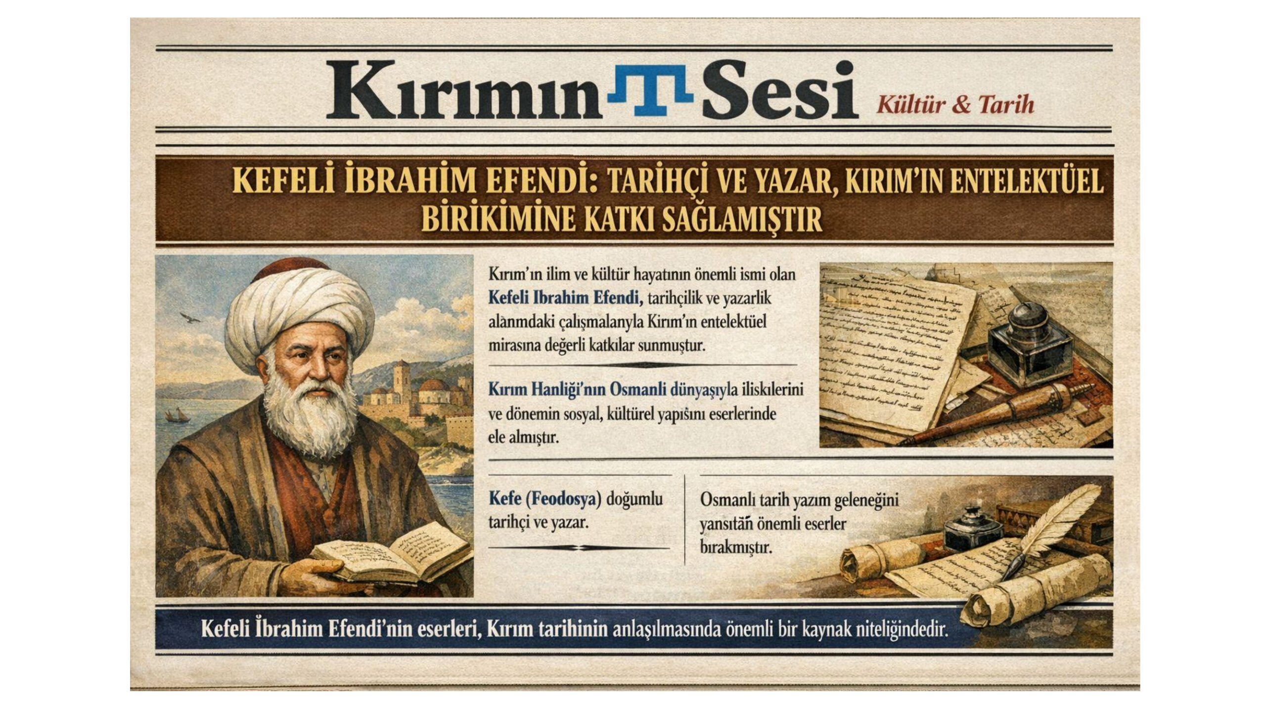 Kırım’ın köklü ilim ve kültür geleneği içinde önemli bir yere sahip olan Kefeli İbrahim Efendi, tarihçi ve yazar kimliğiyle Kırım Tatar halkının entelektüel mirasına değerli katkılar sunmuştur. Kefeli oluşu, yani Kefe (bugünkü Feodosya) kökenli olması, onun Karadeniz’in önemli kültür ve ticaret merkezlerinden birinde yetiştiğini göstermektedir.