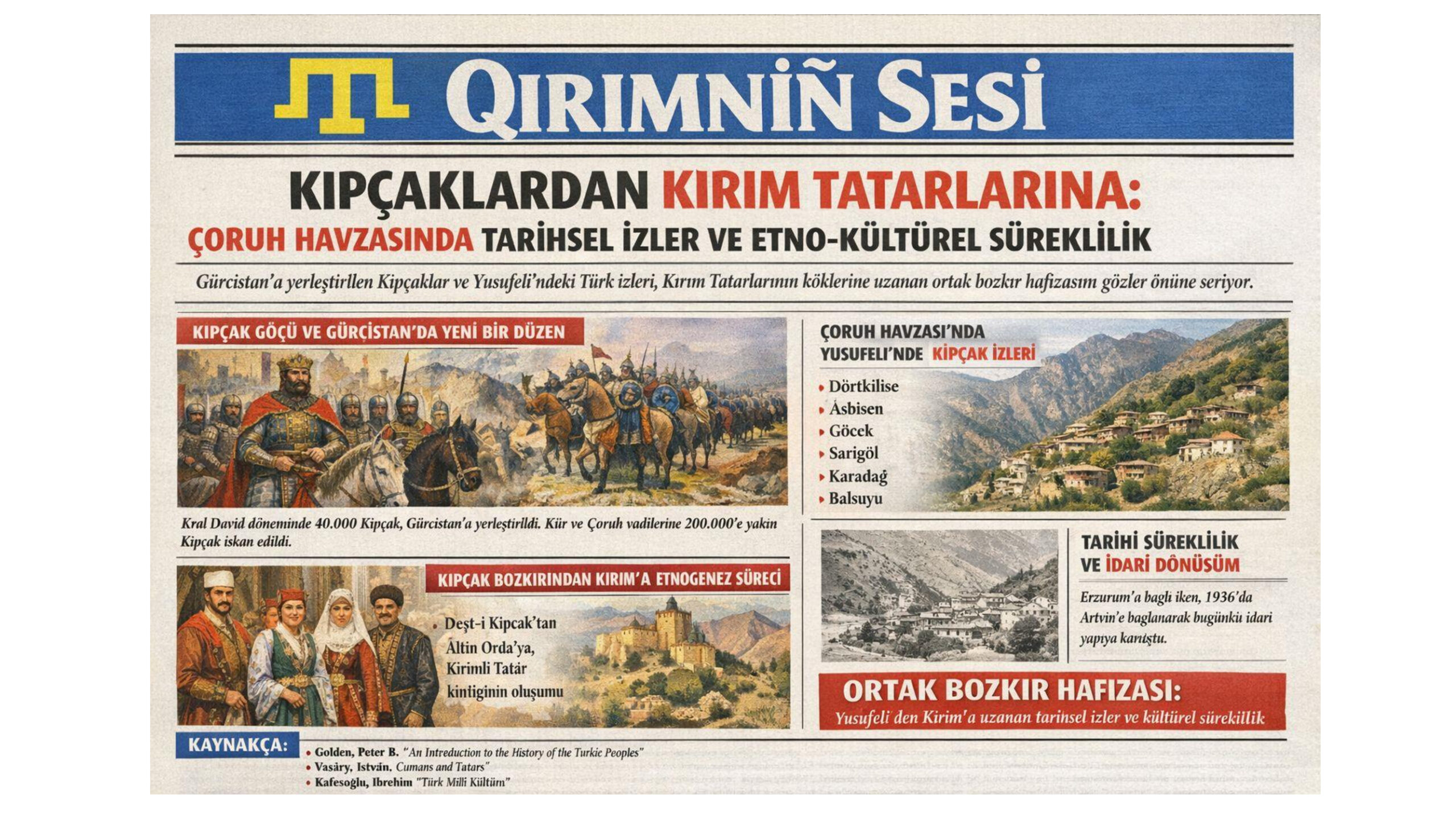 11–12. yüzyıllarda Gürcistan’a yerleştirilen Kıpçak Türkleri, yalnızca bölgenin askerî kaderini değil, Kafkasya’nın etnik ve kültürel yapısını da derinden etkiledi. Bu hareketin izleri bugün Artvin–Yusufeli hattında yer adlarında, kültürde ve tarihsel hafızada yaşamaya devam ediyor. Kırım Tatarlarının kökeninde yer alan Kıpçak mirası ise bu süreci daha geniş bir Avrasya bağlamına oturtuyor.