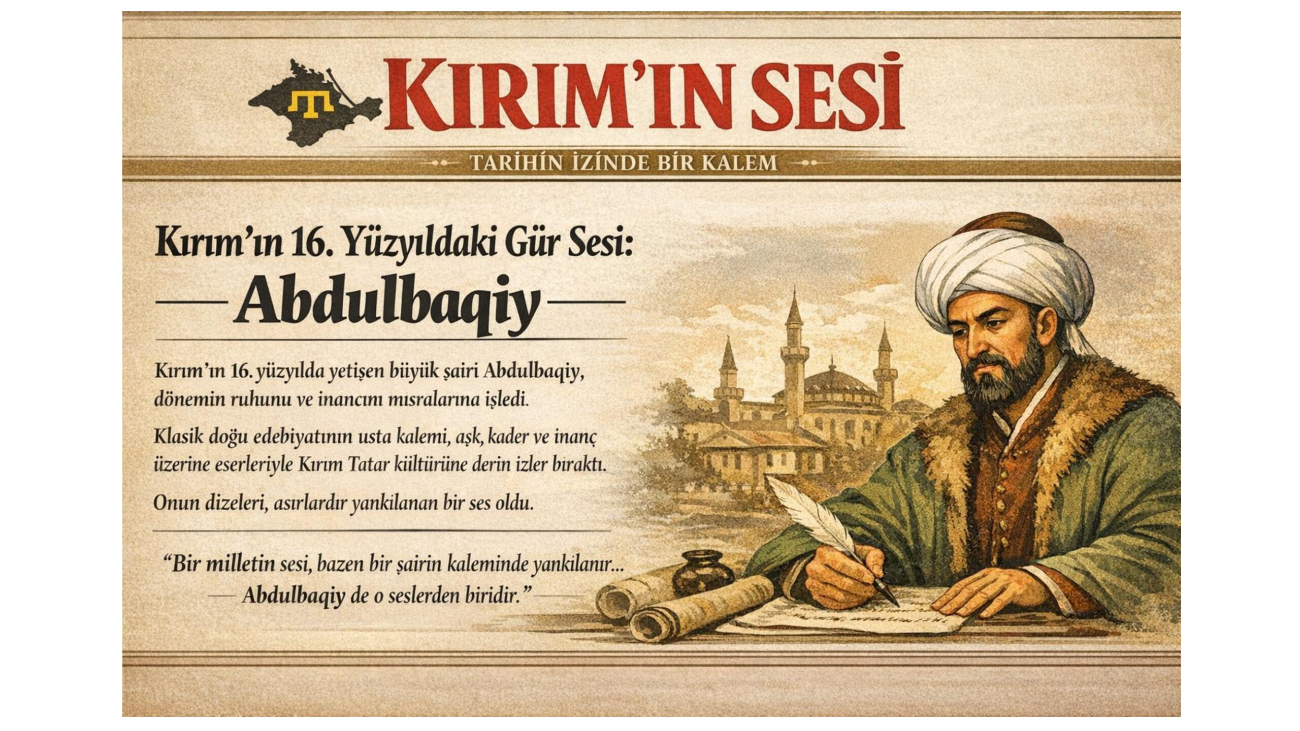 Kırım’ın zengin kültürel ve edebî mirası, asırlar boyunca yetiştirdiği güçlü kalemlerle bugünlere taşındı. Bu isimlerden biri de 16. yüzyılda yaşamış olan şair Abdulbaqiy’dir. Döneminin ruhunu, inancını ve toplumsal dokusunu şiirlerine yansıtan Abdulbaqiy, Kırım Tatar edebiyatının erken dönem temsilcileri arasında önemli bir yer tutar.